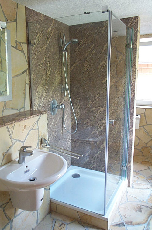 Individuelle Duschtrassen lt. Ihren Maß- und Formangaben können durch uns hergestellt werden. Es besteht die Möglichkeit diese aus 4cm massiven Stein, für bodenbündigen Einbau zu fräsen oder aus einzelnen Platten herzustellen. Passend dazu können 1-2cm starke Rückwände geliefert werden. Der große Vorteil sind die wenigen Fugen im Nassbereich.