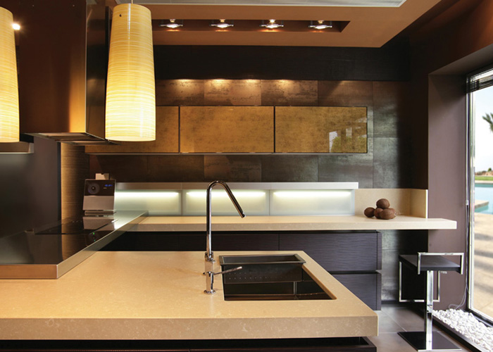 Dank der fortschrittlichen Herstellungsverfahren hält die Arbeitsplatte die täglichen Strapazen ohne zusätzliche Pflege aus. Durch den hohen Quarzanteil weist das Material eine sehr hohe Kratzbeständigkeit auf. Messer und Scheren führen bei normalen Gebrauch zu keiner Beschädigung der Arbeitsplatte. Bei rauen oder matten Oberflächen sind Fettflecke oder Fingerabdrücke eher sichtbar. Die geschlossene Oberfläche nimmt die Flecken jedoch nicht auf.