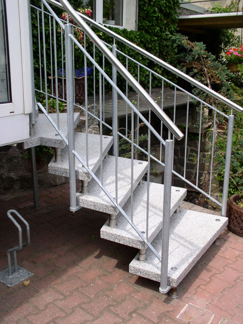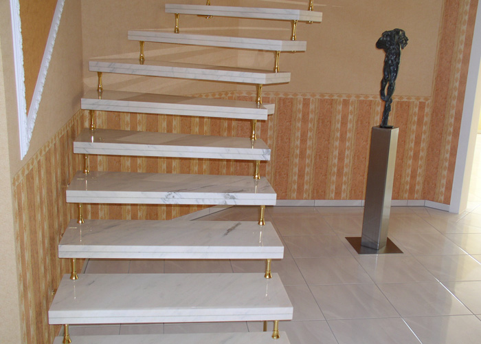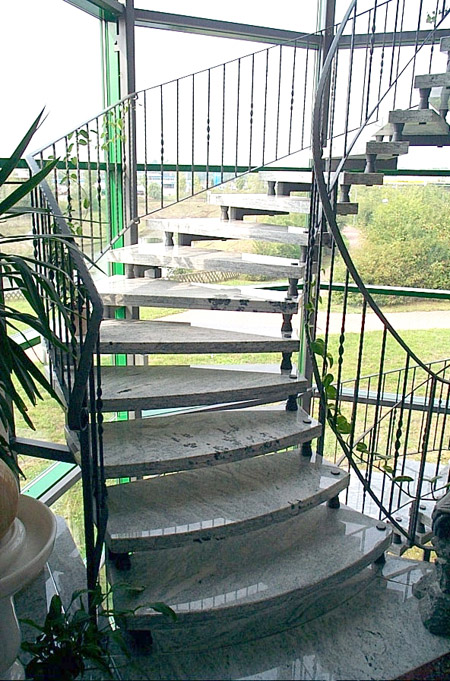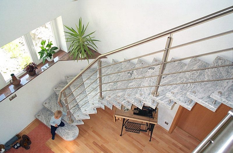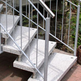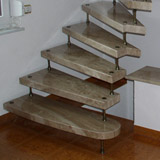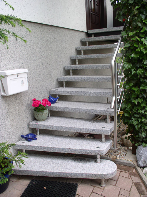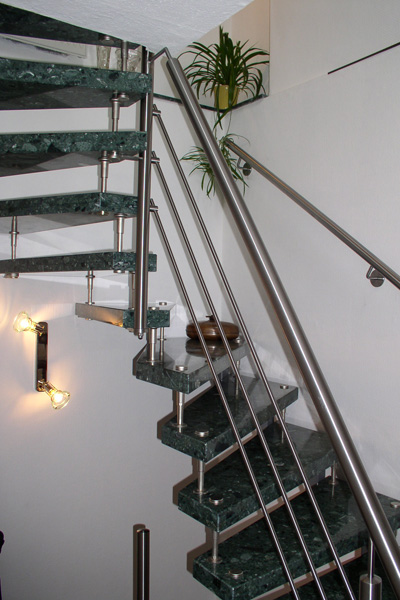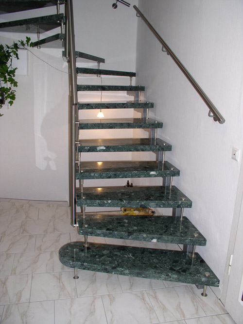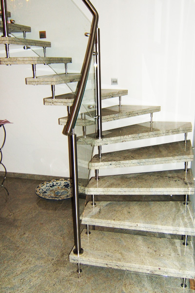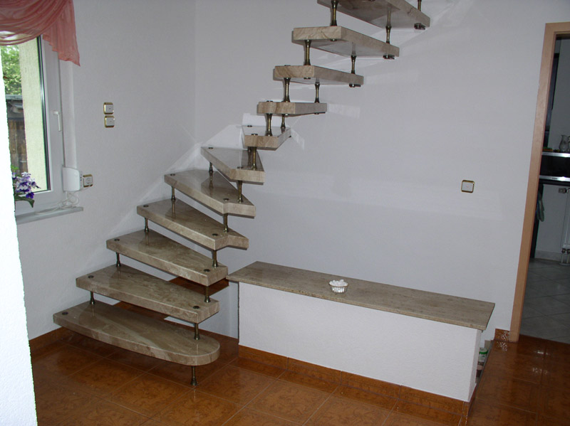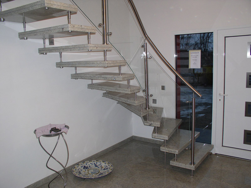 Diese Treppenvariante ist meist von allen Seiten sichtbar und kann durch Ihre „luftige“ Bauweise als gestalterischer Blickpunkt verwendet werden. Die Statik wird durch die Natursteinplatten selbst erbracht. In der Regel werden zwei 3cm starke Platten und eine Armierungsmatte miteinander verklebt.