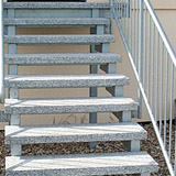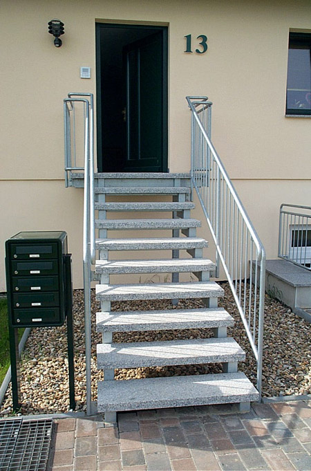 Wangentreppen werden meist im Außenbereich eingesetzt. Hier sollte der Belag min. 6cm stark sein, und die Holme nicht weiter als 80cm auseinander liegen.